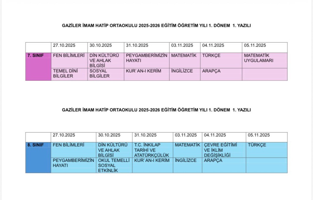 Öğrencilerimizin dönem boyunca edindikleri bilgi ve becerileri ölçmek amacıyla hazırlanmış 1. dönem 1. yazılı sınav takvimi aşağıda yer almaktadır.